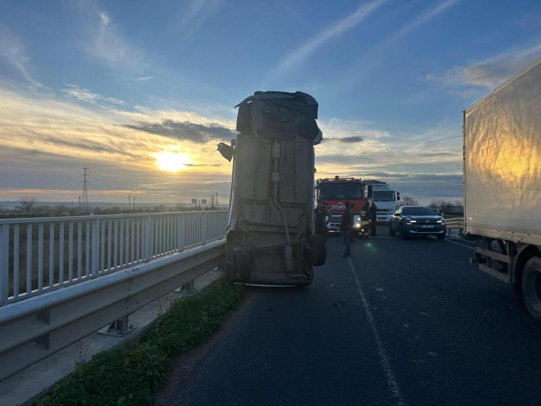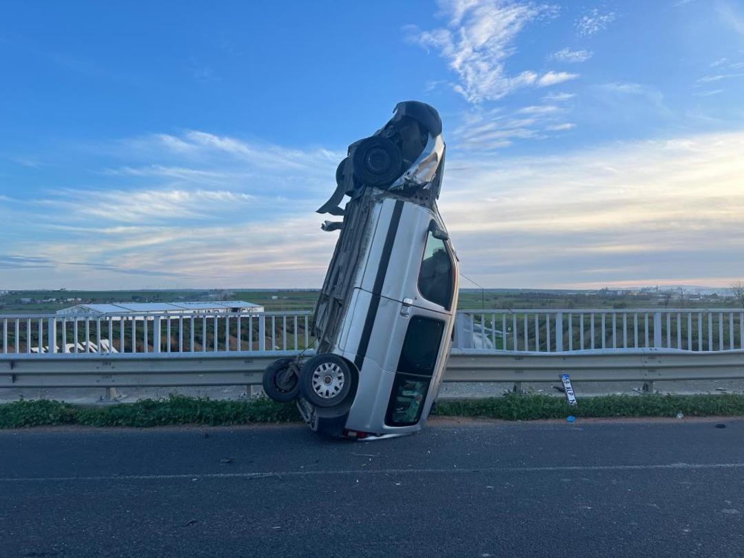 Muratlı–Büyükkarıştıran karayolu üzerinde A.Ç.’nin kullandığı 59 ALP 120 plakalı hafif ticari araç, köprü üzerinde kontrolden çıkarak bariyerlere çarptı ardından dik şekilde durdu. Görenleri hayrete düşüren kazada sürücü A.Ç. ile yolcu H.D. yaralandı.