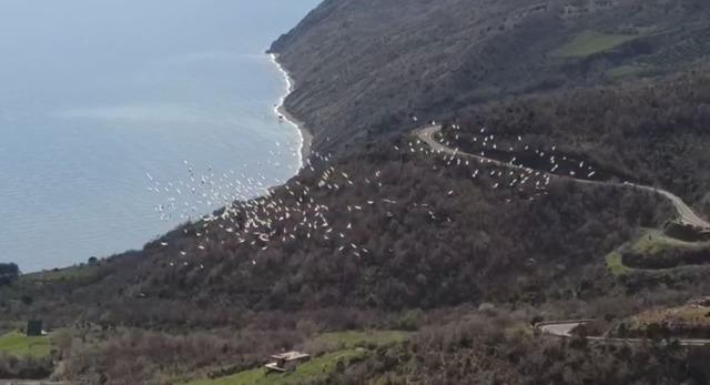 Doğal yaşamın nadir anlarından biri olarak değerlendirilen bu görüntüler, bölgede bulunan bir vatandaş tarafından cep telefonu kamerasıyla anbean kayıt altına alındı. Ortaya çıkan görüntülerde pelikanların düzenli formasyon halinde ilerlediği ve deniz ile dağ manzarasıyla bütünleştiği görüldü.