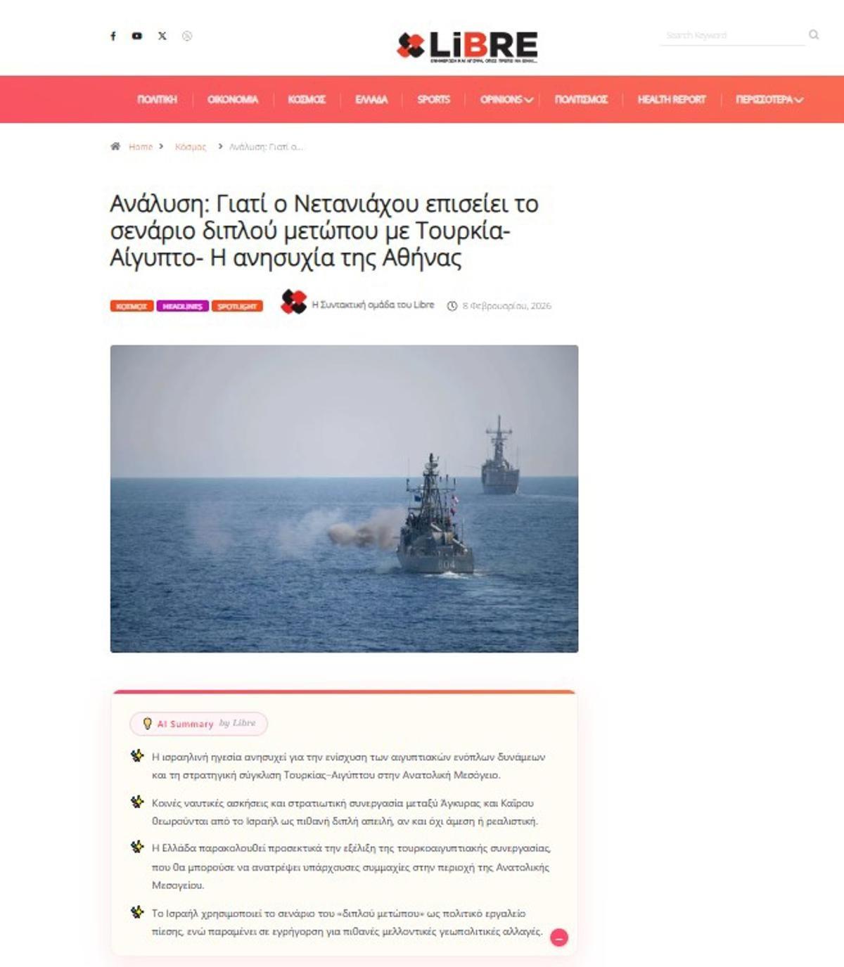 Yunan gazeteci Spyros Sideris imzalı haberde, İsrail Başbakanı Netanyahu'nun, Mısır ordusunun artan askeri kapasitesine ilişkin son açıklamalarının Tel Aviv'deki tedirginliği gözler önüne serdiği ifade edildi. Analize göre, bu endişe Türkiye-Mısır ilişkilerindeki normalleşmeyle daha da derinleşti.