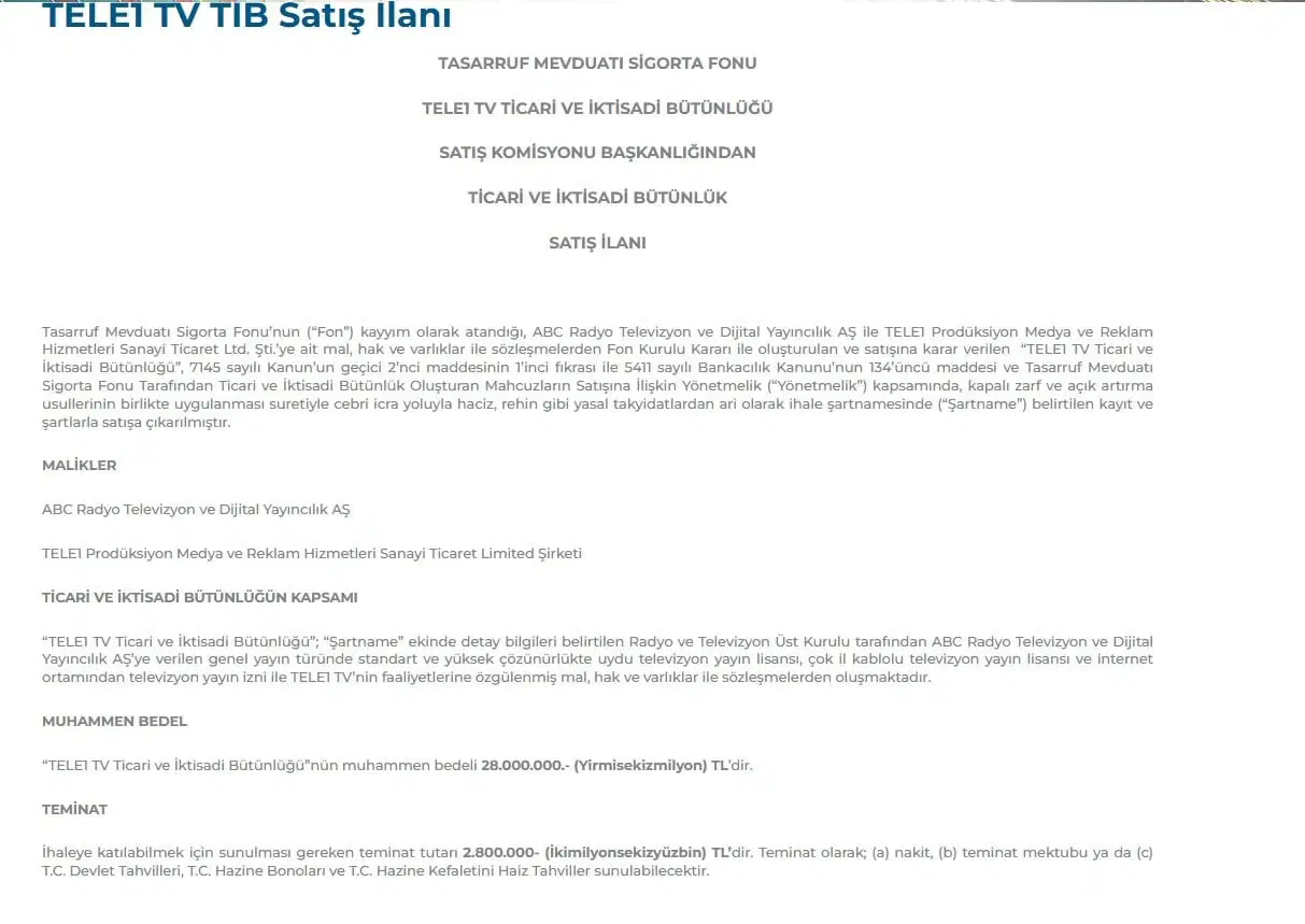 "Tasarruf Mevduatı Sigorta Fonu’nun (“Fon”) kayyım olarak atandığı, ABC Radyo Televizyon ve Dijital Yayıncılık AŞ ile TELE1 Prodüksiyon Medya ve Reklam Hizmetleri Sanayi Ticaret Ltd. Şti.’ye ait mal, hak ve varlıklar ile sözleşmelerden Fon Kurulu Kararı ile oluşturulan ve satışına karar verilen “TELE1 TV Ticari ve İktisadi Bütünlüğü”, 7145 sayılı Kanun’un geçici 2’nci maddesinin 1’inci fıkrası ile 5411 sayılı Bankacılık Kanunu’nun 134’üncü maddesi ve Tasarruf Mevduatı Sigorta Fonu Tarafından Ticari ve İktisadi Bütünlük Oluşturan Mahcuzların Satışına İlişkin Yönetmelik (“Yönetmelik”) kapsamında, kapalı zarf ve açık artırma usullerinin birlikte uygulanması suretiyle cebri icra yoluyla haciz, rehin gibi yasal takyidatlardan ari olarak ihale şartnamesinde (“Şartname”) belirtilen kayıt ve şartlarla satışa çıkarılmıştır.