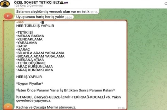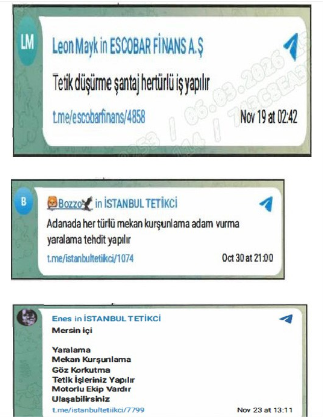 "Telegram isimli sosyal medya uygulamasındaki hesaplarında suç içerikli (yeni nesil suç örgütlerinin eylemleriyle benzer şekilde 'tetik işleriniz yapılır, infaz, bel altı bel üstü, mekan kurşunlanır, haraç kesme, İstanbul içi mekan yaralama, tetik düşürülür' şeklinde) paylaşımlar yapan şahıslara yönelik Cumhuriyet Başsavcılığımız Örgütlü Suçlar Bürosu tarafından yürütülen soruşturma kapsamında;"