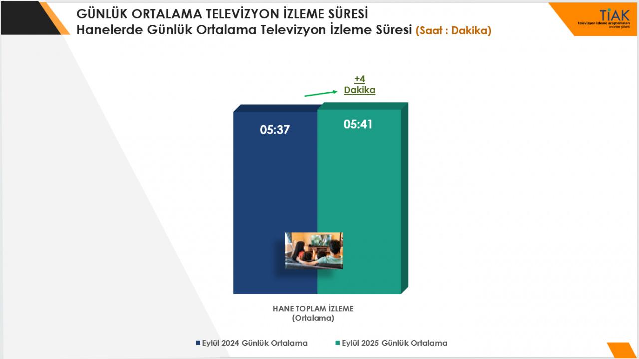 Eylül ayının tüm günlerinde Türkiye genelinde hanelerde günlük ortalama 5 saat 41 dakika televizyon izlendi. Geçtiğimiz yıl ile karşılaştırıldığında bu sürenin ortalama 4 dakikalık artışla bu noktaya geldiği görüldü.
