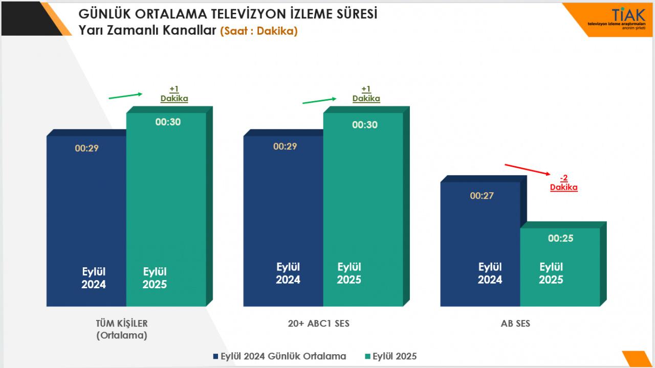 Ana İzleyici Kitlesi olarak tanımlanan 20 yaş üzeri ABC1 Sosyo-Ekonomik Statüdeki izleyicilerde 3 dakika artış görülerek günlük izleme süresi 3 Saat 12 dakikaya, AB Sosyo-Ekonomik Statüdeki izleyicilerde 2024’e göre 4 dakikalık artış ile 2 Saat 49 dakikaya çıktı.