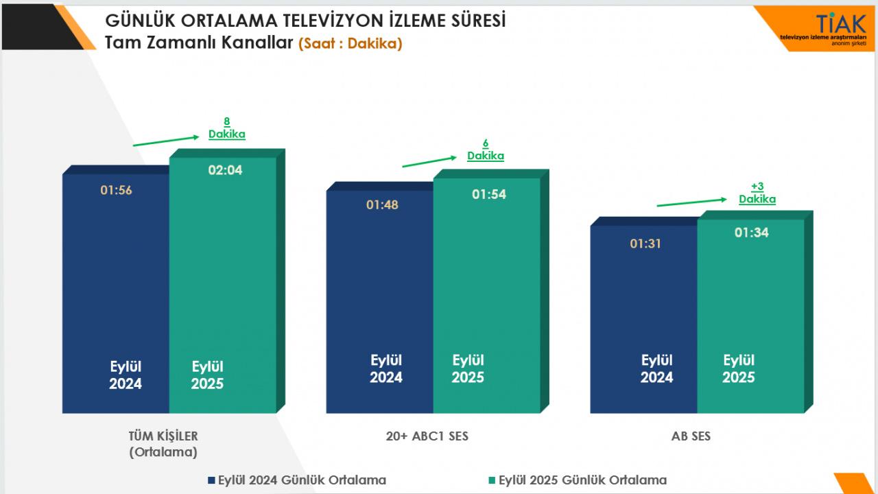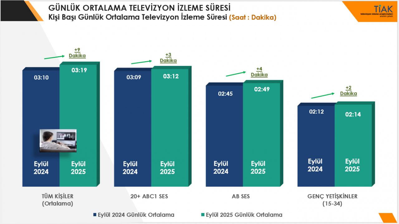 Hanelerde kişi başı televizyon izleme süresi ise 2024 Eylül ayına göre 9 dakika artarak 3 saat 10 dakikadan 3 saat 19 dakikaya yükseldi.