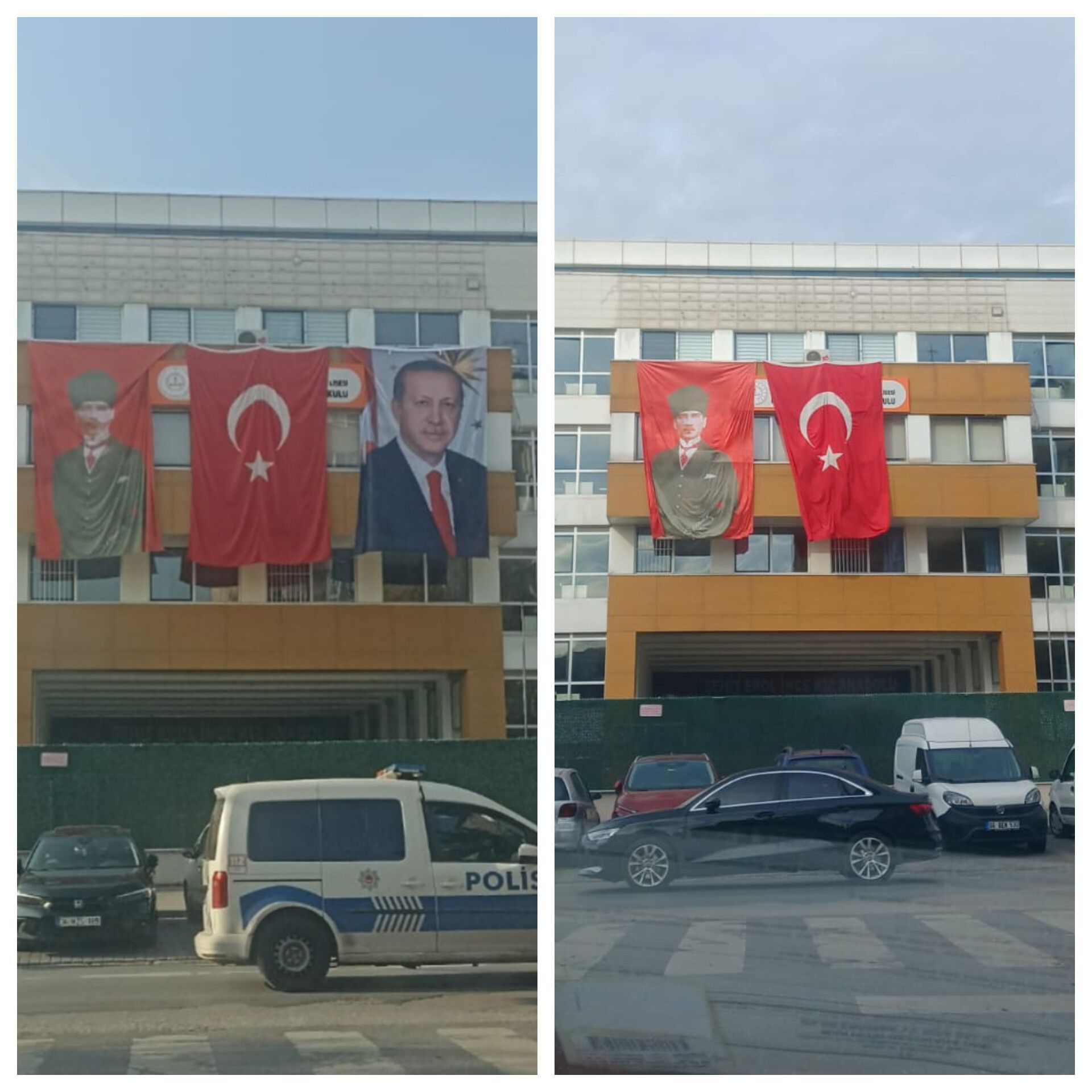 Ümraniye'de 10 Kasım için Şehit Erol İnce İmam Hatip Lisesi'ne Atatürk ve Türk Bayrağı'nın yanında Erdoğan posteri asılmıştı.