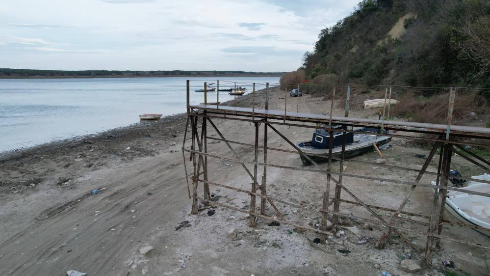 Balaban kıyısında suyun geri çekilmesiyle göl tabanı ortaya çıktı. Normalde su üstünde kalması gereken iskele ve balıkçı tekneleri, karaya oturdu. Terkos Gölü’ndeki su çekilmesi drone kamerasıyla havadan görüntülendi.