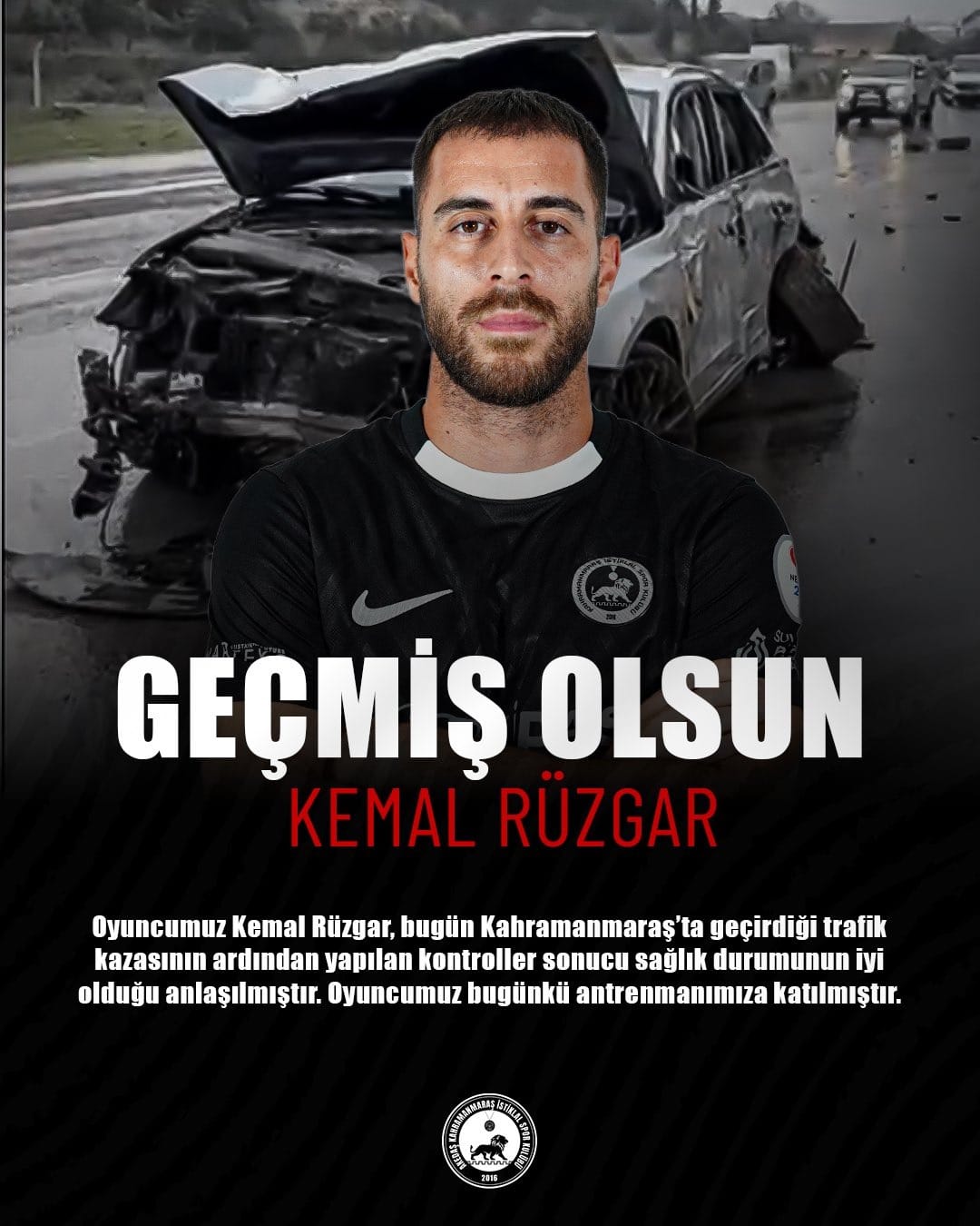 Oyuncumuz Kemal Rüzgar, bugün Kahramanmaraş'ta geçirdiği trafik kazasının ardından yapılan kontroller sonucu sağlık durumunun iyi olduğu anlaşılmıştır, Oyuncumuz bugünkü antrenmanımıza katılmıştır.