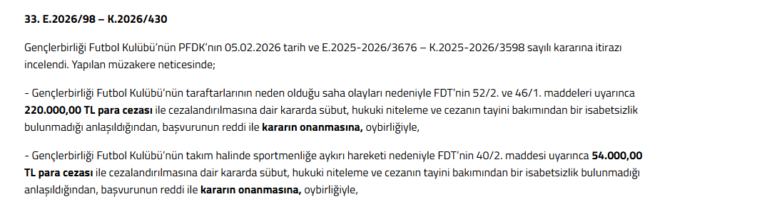 TFF’den karara ilişkin yapılan açıklamada “Gençlerbirliği Futbol Kulübü’nün taraftarlarının neden olduğu saha olayları nedeniyle FDT’nin 52/2. ve 46/1. maddeleri uyarınca 220.000,00 TL para cezası ile cezalandırılmasına dair kararda sübut, hukuki niteleme ve cezanın tayini bakımından bir isabetsizlik bulunmadığı anlaşıldığından, başvurunun reddi ile kararın onanmasına, oybirliğiyle karar verilmiştir” denildi.