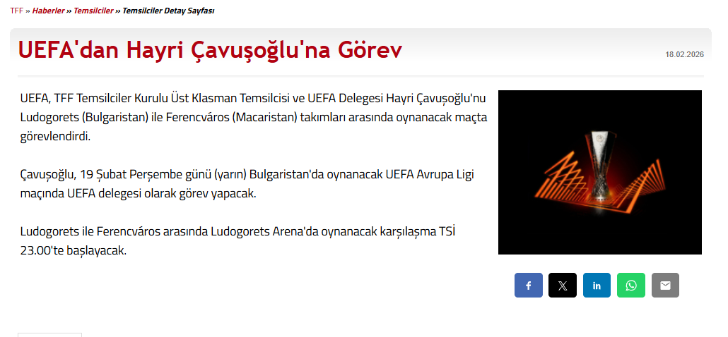 UEFA’DAN GÖREVTFF Temsilciler Kurulu Üst Klasman Temsilcisi ve UEFA Delegesi olan Hayri Çavuşoğlu, UEFA tarafından görevlendirildi. Çavuşoğlu, 19 Şubat Perşembe günü Bulgaristan’da Ludogorets ile Ferencvaros arasında oynanacak UEFA Avrupa Ligi maçında UEFA delegesi olarak görev yapacak. Karşılaşma TSİ 23.00’te başlayacak.