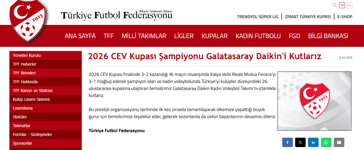 Türkiye Futbol Federasyonu, resmi açıklamasında Galatasaray Daikin’i kutlayarak şu mesajı verdi: