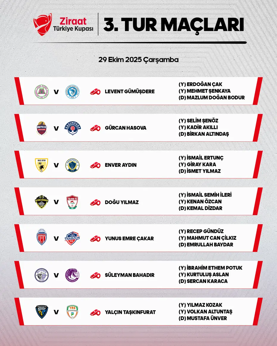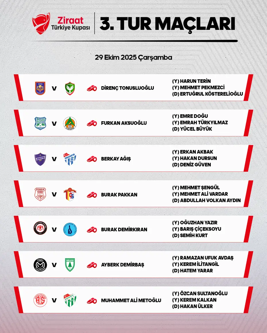 Ziraat Türkiye Kupası’nda 3. tur başlıyor. 29 ve 30 Ekim tarihlerinde oynanacak maçlar öncesi Merkez Hakem Kurulu (MHK) düdük çalacak hakemleri açıkladı.