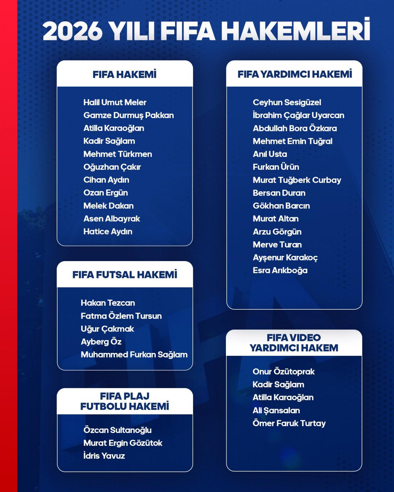 TFF'nin internet sitesinden yapılan açıklamaya göre yarından itibaren geçerli olacak ve FIFA tarafından onaylanan listede şu hakemler yer alıyor:
