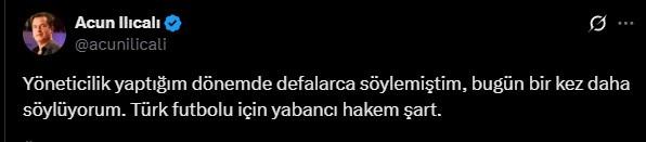Acun Ilıcalı, "Yöneticilik yaptığım dönemde defalarca söylemiştim, bugün bir kez daha söylüyorum. Türk futbolu için yabancı hakem şart." ifadelerini kullandı.