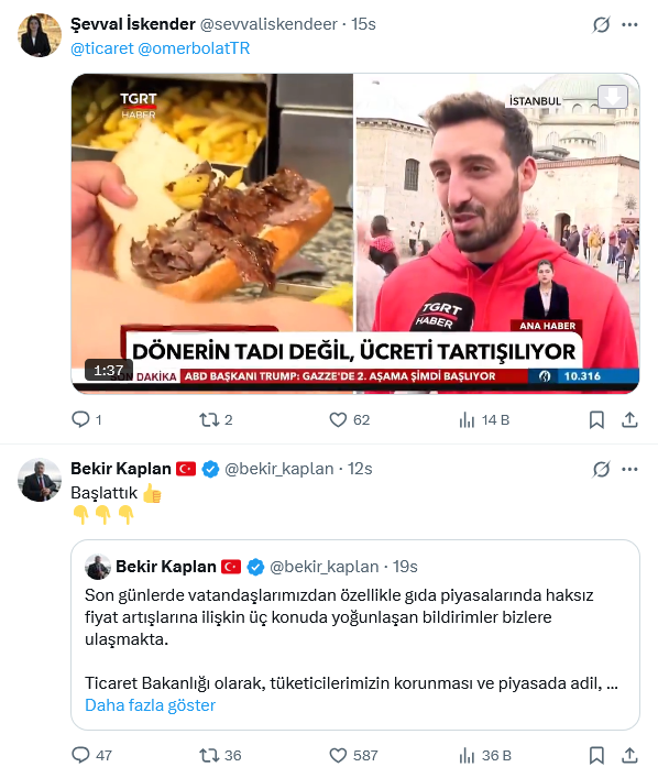 TGRT HABER MUHABİRİ BAKAHNLIĞA ŞİKAYET ETTİ AMA...Söz konusu işletmeye ait ilk fiyatların yer aldığı paylaşımı alıntılayan TGRT Haber Muhabiri Şevval İskander Ticaret Bakanlığı’na Basın Danışmanı Bekir Kaplan'ı etiketleye4rek “Kasapta etin kilosu 800 lira, bu restoranda 80 gram döner 615 TL. Dükkan, çalışan, malzeme giderleri eklenmiş olsa bile fiyat bu kadar fahiş olmamalı” diye işletmeyi şikayet etti.