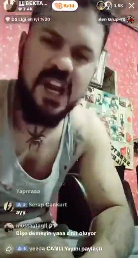 "GÜCÜNÜZ YETİYORSA BENİM ELİMDEN ALIN" DİYEREK MEYDAN OKUDUŞüpheli şahıs, yayını izleyen kullanıcıların, "Şikayet edin, kadını kurtarsınlar" yorumları üzerine, "O benim canım. O benim k...ğim. Gücünüz yetiyorsa elimden alın" diyerek meydan okudu.