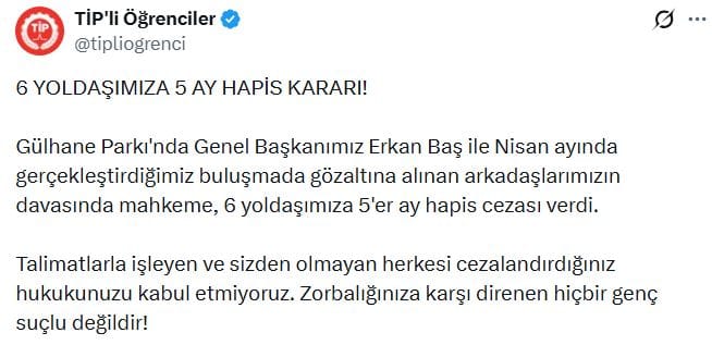"6 yoldaşımıza 5 ay hapis kararı! Gülhane Parkı'nda Genel Başkanımız Erkan Baş ile Nisan ayında gerçekleştirdiğimiz buluşmada gözaltına alınan arkadaşlarımızın davasında mahkeme, 6 yoldaşımıza 5'er ay hapis cezası verdi. Talimatlarla işleyen ve sizden olmayan herkesi cezalandırdığınız hukukunuzu kabul etmiyoruz. Zorbalığınıza karşı direnen hiçbir genç suçlu değildir!"