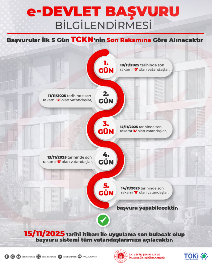 TOKİ tarafından yapılan açıklamaya göre, başvurular TC kimlik numarasının son rakamına göre alınacak. Böylece yoğunluğu önlemek ve sürecin düzenli ilerlemesini sağlamak amaçlanıyor.