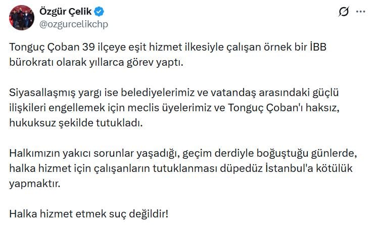 "Tonguç Çoban 39 ilçeye eşit hizmet ilkesiyle çalışan örnek bir İBB bürokratı olarak yıllarca görev yaptı. Siyasallaşmış yargı ise belediyelerimiz ve vatandaş arasındaki güçlü ilişkileri engellemek için meclis üyelerimiz ve Tonguç Çoban'ı haksız, hukuksuz şekilde tutukladı. Halkımızın yakıcı sorunlar yaşadığı, geçim derdiyle boğuştuğu günlerde, halka hizmet için çalışanların tutuklanması düpedüz İstanbul'a kötülük yapmaktır. Halka hizmet etmek suç değildir!"