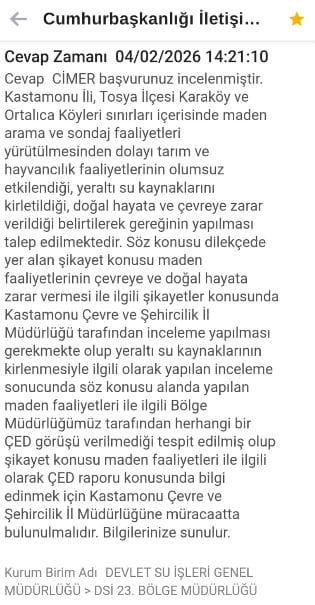 Söz konusu dilekçede yer alan şikayet konusu maden faaliyetlerinin çevreye ve doğal hayata zarar vermesi ile ilgili şikayetler konusunda Kastamonu Çevre ve Şehircilik İl Müdürlüğü tarafından inceleme yapılması gerekmekte olup yeraltı su kaynaklarının kirlenmesiyle ilgili olarak yapılan inceleme sonucunda söz konusu alanda yapılan maden faaliyetleri ile ilgili Bölge Müdürlüğümüz tarafından herhangi bir ÇED görüşü verilmediği tespit edilmiş olup şikayet konusu maden faaliyetleri ile ilgili olarak ÇED raporu konusunda bilgi edinmek için Kastamonu Çevre ve Şehircilik İl Müdürlüğüne müracaatta bulunulmalıdır"