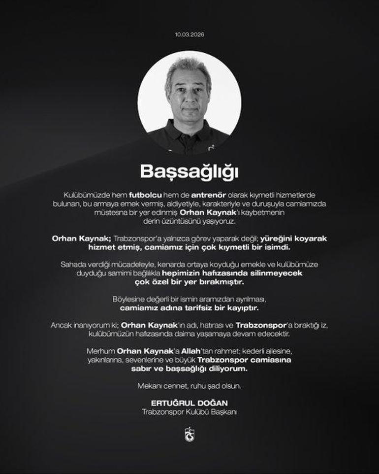“Kulübümüzde hem futbolcu hem de antrenör olarak kıymetli hizmetlerde bulunan, bu armaya emek vermiş, aidiyetiyle, karakteriyle ve duruşuyla camiamızda müstesna bir yer edinmiş Orhan Kaynak’ı kaybetmenin derin üzüntüsünü yaşıyoruz. Orhan Kaynak; Trabzonspor’a yalnızca görev yaparak değil; yüreğini koyarak hizmet etmiş, camiamız için çok kıymetli bir isimdi. Sahada verdiği mücadeleyle, kenarda ortaya koyduğu emekle ve kulübümüze duyduğu samimi bağlılıkla hepimizin hafızasında silinmeyecek çok özel bir yer bırakmıştır. Böylesine değerli bir ismin aramızdan ayrılması, camiamız adına tarifsiz bir kayıptır. Ancak inanıyorum ki; Orhan Kaynak’ın adı, hatırası ve Trabzonspor’a bıraktığı iz, kulübümüzün hafızasında daima yaşamaya devam edecektir. Merhum Orhan Kaynak’a Allah’tan rahmet; kederli ailesine, yakınlarına, sevenlerine ve büyük Trabzonspor camiasına sabır ve başsağlığı diliyorum. Mekanı cennet, ruhu şad olsun.”