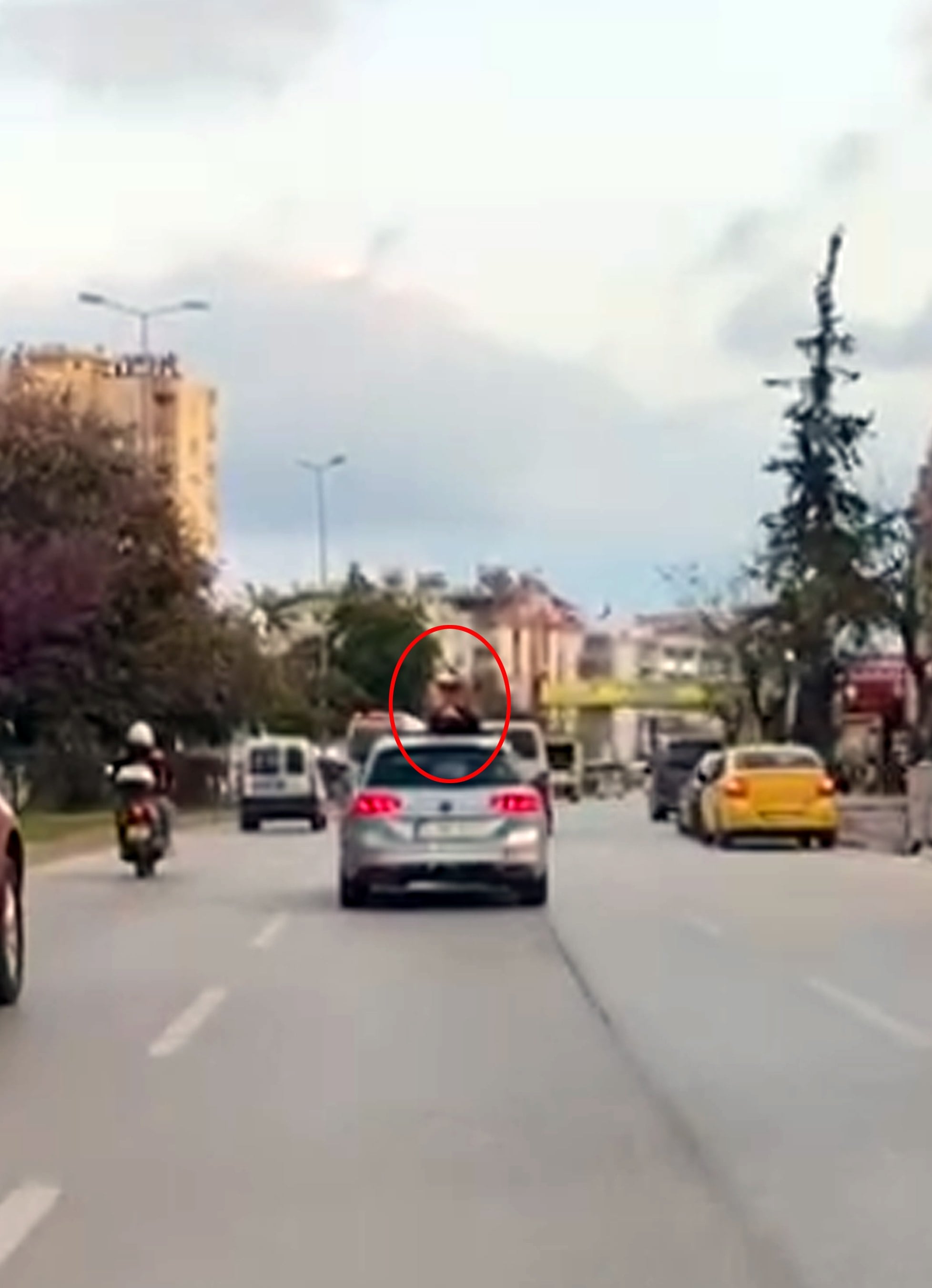 Antalya'nın Muratpaşa ilçesi Kızılırmak Caddesi üzerinde 8 Nisan akşamı ilerleyen bir otomobildeki kadın yolcu, aracın açılır tavanından dışarı çıktı. Seyir halindeki araçta müzik eşliğinde dans eden kadın, hem kendi can güvenliğini hem de trafikteki diğer araçları tehlikeye attı.
