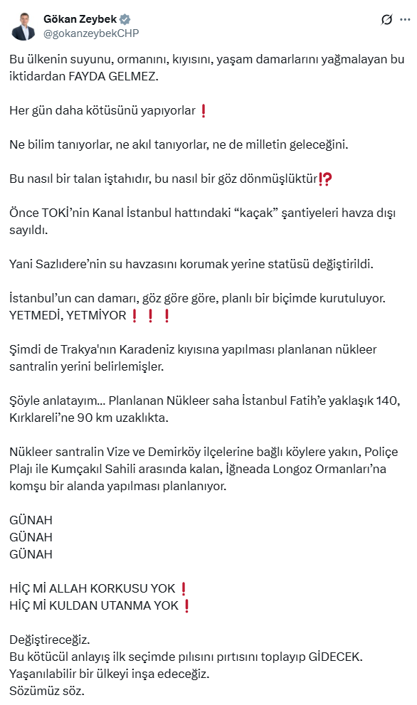 Trakya'nın Karadeniz kıyısına yapılması planlanan nükleer santralın İstanbul Fatih’e yaklaşık 140, Kırklareli’ne 90 km uzaklıkta olduğunu belirten Zeybek'in açıklamasında, şu ifadelere yer verildi: