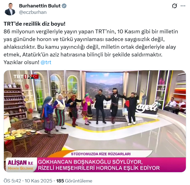 CHP Genel Başkan Yardımcısı Burhanettin Bulu da sosyal medya hesabındaki paylaşımında, "TRT’de rezillik diz boyu! 86 milyonun vergileriyle yayın yapan TRT’nin, 10 Kasım gibi bir milletin yas gününde horon ve türkü yayınlaması sadece saygısızlık değil, ahlaksızlıktır. Bu kamu yayıncılığı değil, milletin ortak değerleriyle alay etmek, Atatürk'ün aziz hatırasına bilinçli bir şekilde saldırmaktır. Yazıklar olsun!" diyerek tepkisini dile getirdi.