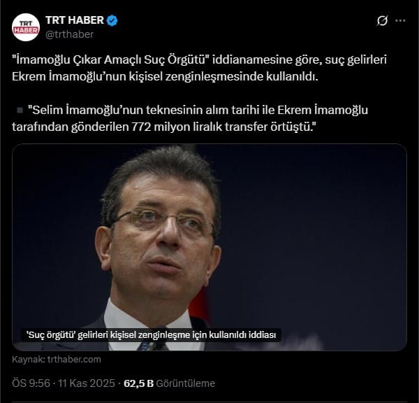 Vatandaşın vergileriyle yayın yapan TRT Haber'in X hesabında skandal bir paylaşıma imza atıldı. 19 Mart'ta gözaltına alındıktan sonra 23 Mart'ta tutuklanan, 237 gün boyunca iddianame hazırlanmdan Marmara Cezaevi'nde tutulan ve hakkında İstanbul Cumhuriyet Başsavcılığı tarafından 3 bin 900 sayfalık bir iddianame ile 2352 hapsi istenen İstanbul Büyükşehir Belediye Başkanı ve Cumhurbaşkanı adayı Ekrem İmamoğlu'nun oğlu Selim İmamoğlu'nun 772 milyon TL'lik tekne aldığı şeklinde bir "haber" TRT Haber tarafından servis edildi.