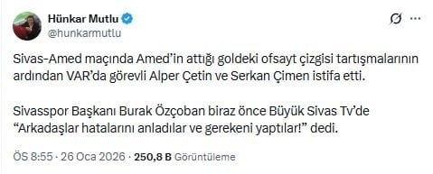 Sosyal medya hesabından paylaşımda bulunan Hünkar Mutlu, VAR’da görev yapan Alper Çetin ile AVAR hakemi Serkan Çimen’in istifa ettiğini ileri sürdü.