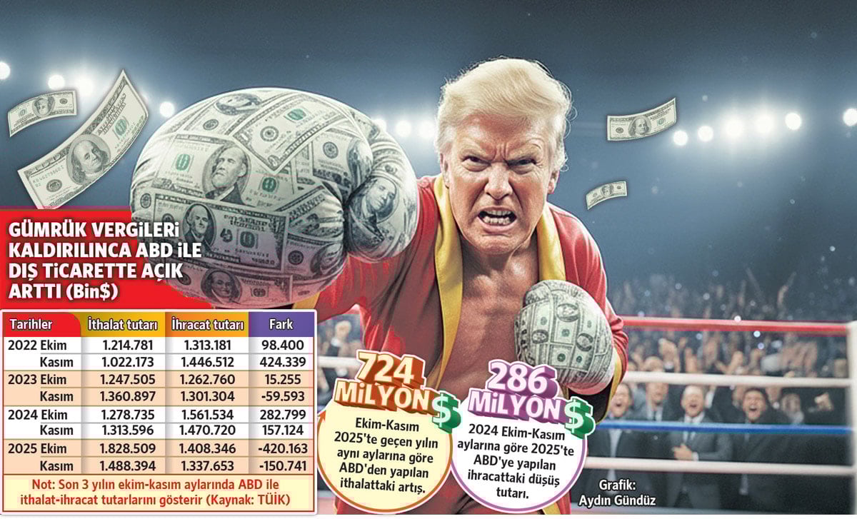 22 Eylül 2025’te yürürlüğe giren düzenlemenin Cumhurbaşkanı Tayyip Erdoğan ile ABD Başkanı Donald Trump görüşmesi öncesinde alınması bu bağlamda eleştirilerin hedefi olmuştu. Kararı takip eden 2 ayda dış ticaret verileri de olumsuz tabloyu gözler önüne serdi. Yüzde 10 ile yüzde 70 arasında değişen ek gümrük vergilerinin karşılıklı müzakereler, diplomatik iyileşme ve ticaret hacmini artırma amaçları doğrultusunda kaldırıldığı öne sürülse de Türkiye İstatistik Kurumu’nun (TÜİK) dış ticaret verileri, uygulamanın ABD lehine çalıştığını gösterdi.