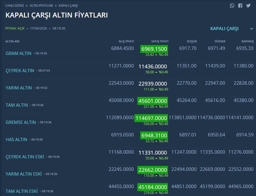 Kapalıçarşı altın fiyatları ile resmi altın fiyatları arasındaki fark devam ediyor. Kapalıçarşı'da gram altın 6 bin 969 lirada bulunuyor.