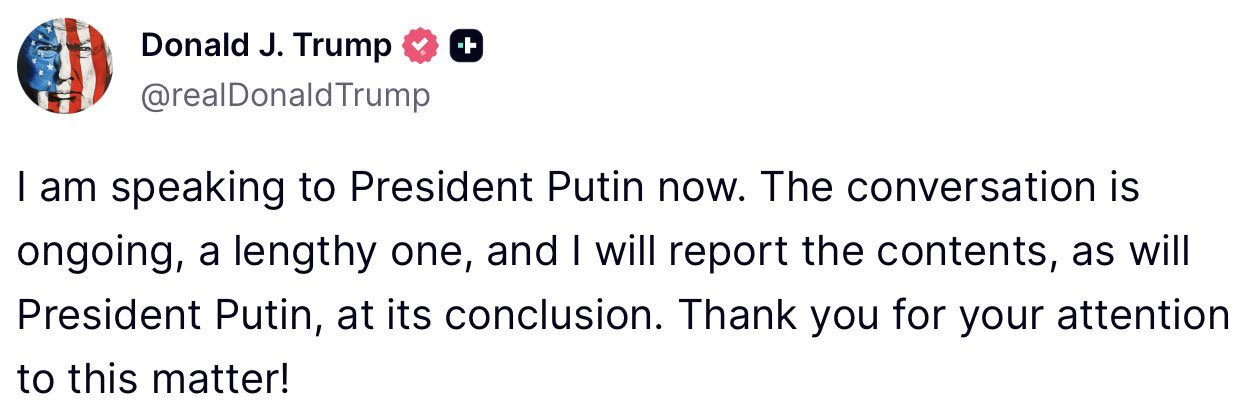 Konuyla ilgili sosyal medya hesabından açıklamalarda bulunan ABD Başkanı Donald Trump, "Şu anda Başkan Putin ile görüşüyorum. Görüşme devam ediyor, uzun bir görüşme ve görüşmenin içeriğini, Başkan Putin'in de yapacağı gibi, sonunda aktaracağım." ifadelerini kullandı.