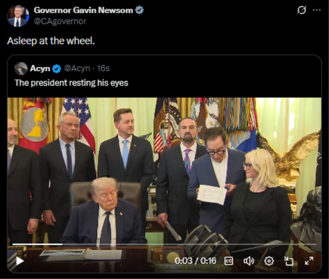 SOSYAL MEDYADA “UYKULU DON” GÖNDERMESİGörüntülerin yayılmasının ardından California Valisi Gavin Newsom, Trump’ı hedef aldı. Newsom, sosyal medya platformu X üzerinden yaptığı paylaşımda Trump için “Uykulu Don” ifadesini kullandı. Paylaşılan videolarda Trump’ın kısa süreliğine uyukladığı, ardından aniden irkilerek uyandığı ve tekrar gözlerini kapattığı anlar yer aldı. Newsom, bir paylaşımında “Direksiyon başında uyuyor” yorumunu yaptı.