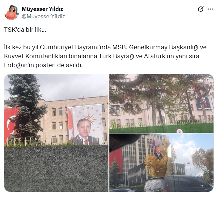 "TSK'DA BİR İLK..."O görüntüleri Gazeteci Müyesser Yıldız, sosyal medya hesabından paylaştı. Yıldız'ın paylaşımında, "TSK'da bir ilk... İlk kez bu yıl Cumhuriyet Bayramı'nda MSB, Genelkurmay Başkanlığı ve Kuvvet Komutanlıkları binalarına Türk Bayrağı ve Atatürk'ün yanı sıra Erdoğan'ın posteri de asıldı." ifadeleri yer aldı.
