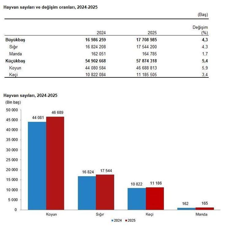 TÜİK, 2025 dönemine ilişkin hayvansal üretim istatistiklerini açıkladı. Buna göre, büyükbaş sayısı bir önceki yıla göre yüzde 4,3 artarak 17 milyon 709 bin baş oldu. Büyükbaş kategorisinde, sığır sayısı bir önceki yıla göre yüzde 4,3 artarak 17 milyon 544 bin baş, manda sayısı ise bir önceki yıla göre yüzde 1,7 artarak 164 bin 785 baş oldu. Küçükbaş sayısı bir önceki yıla göre yüzde 5,4 artarak 57 milyon 874 bin baş oldu. Küçükbaş kategorisinde, koyun sayısı bir önceki yıla göre yüzde 5,9 oranında artarak 46 milyon 689 bin baş, keçi sayısı ise bir önceki yıla göre yüzde 3,4 oranında artarak 11 milyon 186 bin baş oldu.
