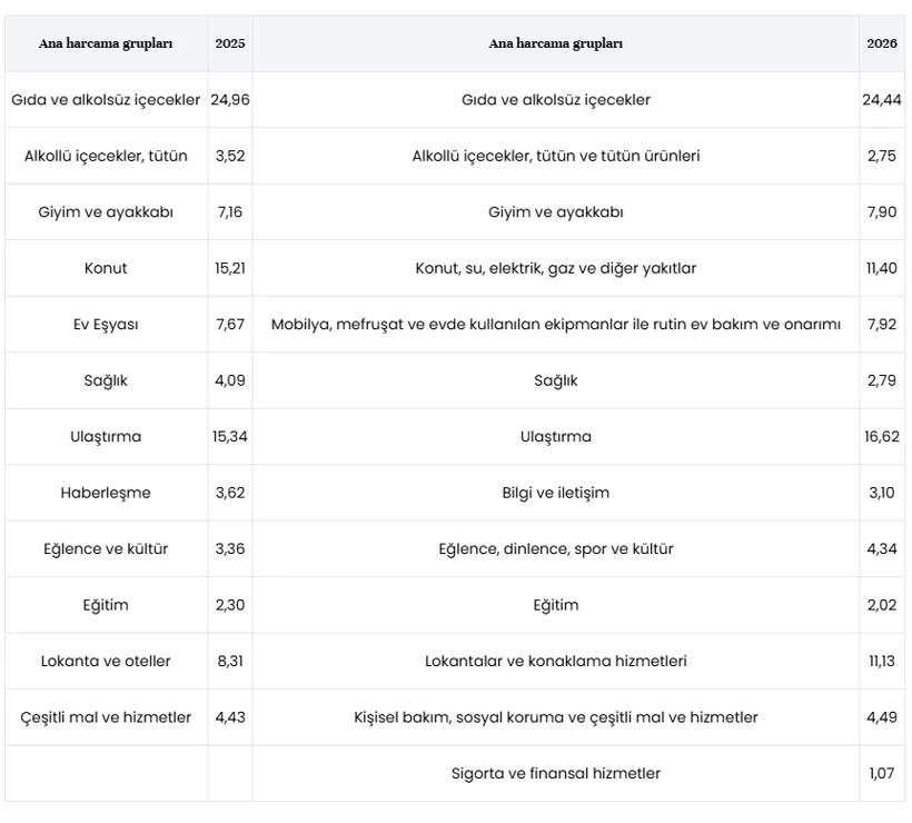TÜFE hesaplamalarında kullanılacak ana grup ağırlıkları da belirlendi. TÜİK in enflasyon hesaplama güncellemesiyle 2003 100 olan baz yılını 2025 100 olarak değiştirmesiyle ana grup sayısı da 12 den 13 e çıktı. Bazı ana grupların isimlerinde de değişikliğe gidildi.