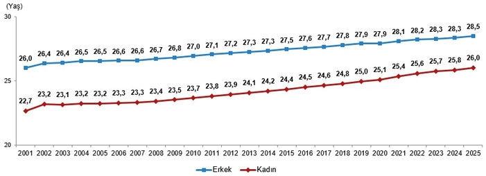 İLK EVLENME YAŞI 30'A İLERLİYORGençlerin evlilikten uzaklaşması veya ertelemesi de istatistiklere yansıdı. 2001 yılında erkeklerde 26, kadınlarda 22,7 olan ortalama ilk evlenme yaşı, 2025 yılı itibarıyla erkeklerde 28,5'e, kadınlarda ise 26'ya yükseldi.