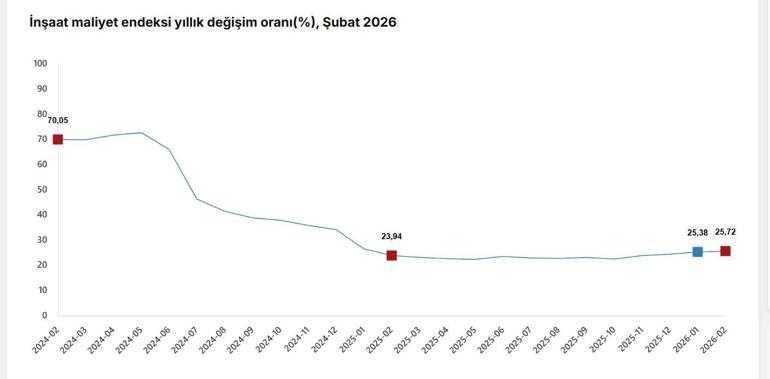 TÜİK, Şubat 2026 dönemine ilişkin inşaat maliyet endeksi verilerini açıkladı. Buna göre; inşaat maliyeti şubat ayında bir önceki aya göre yüzde 1,51, bir önceki yılın aynı ayına göre yüzde 25,72 arttı. Bir önceki aya göre malzeme endeksi yüzde 2,33, işçilik endeksi yüzde 0,20 arttı. Ayrıca bir önceki yılın aynı ayına göre malzeme endeksi yüzde 23,73, işçilik endeksi de yüzde 29,12 arttı. Bina inşaatı maliyet endeksi, bir önceki aya göre yüzde 1,25, bir önceki yılın aynı ayına göre yüzde 25,72 arttı. Bir önceki aya göre malzeme endeksi yüzde 2,08 arttı, işçilik endeksi yüzde 0,04 azaldı. Ayrıca bir önceki yılın aynı ayına göre malzeme endeksi yüzde 23,89, işçilik endeksi yüzde 28,74 arttı. Bina dışı yapılar için inşaat maliyet endeksi de bir önceki aya göre yüzde 2,36, bir önceki yılın aynı ayına göre yüzde 25,72 arttı. Bir önceki aya göre malzeme endeksi yüzde 3,11, işçilik endeksi yüzde 1,03 arttı. Ayrıca bir önceki yılın aynı ayına göre malzeme endeksi yüzde 23,24, işçilik endeksi yüzde 30,46 arttı.