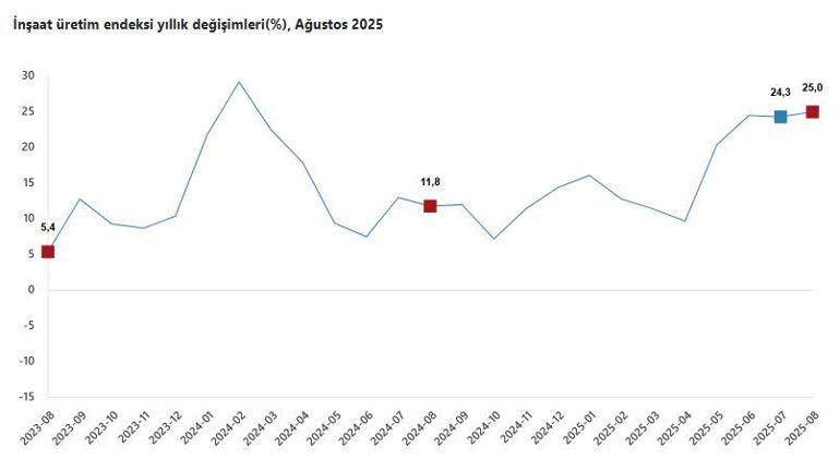 TÜİK, Ağustos 2025 inşaat üretim endeksi verilerini açıkladı. Buna göre; inşaat üretimi, bir önceki yılın aynı ayına göre yüzde 25 arttı. İnşaatın alt sektörleri incelendiğinde, 2025 yılı Ağustos ayında bina inşaatı sektörü endeksi bir önceki yılın aynı ayına göre yüzde 26,6 arttı, bina dışı yapıların inşaatı sektörü endeksi yüzde 17,4 arttı ve özel inşaat faaliyetleri sektörü endeksi yüzde 25,1 arttı.
