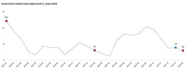 TÜİK, Şubat 2026 dönemine ilişkin inşaat üretim endeksi verilerini açıkladı. Buna göre; inşaat üretimi şubat ayında bir önceki yılın aynı ayına göre yüzde 5,9 arttı. İnşaatın alt sektörleri incelendiğinde; 2026 yılı Şubat ayında bina inşaatı sektörü endeksi bir önceki yılın aynı ayına göre yüzde 4,9 arttı, bina dışı yapıların inşaatı sektörü endeksi yüzde 12 arttı ve özel inşaat faaliyetleri sektörü endeksi yüzde 5,5 arttı. Şubat ayında inşaat üretimi bir önceki aya göre yüzde 1,3 azaldı. Alt sektörleri incelendiğinde; 2026 yılı Şubat ayında bina inşaatı sektörü endeksi bir önceki aya göre yüzde 2,5 azaldı, bina dışı yapıların inşaatı sektörü endeksi yüzde 1,2 arttı ve özel inşaat faaliyetleri sektörü endeksi yüzde 1,3 arttı.