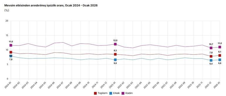 TÜİK, Ocak 2025 dönemine ilişkin iş gücü istatistiklerini açıkladı. Buna göre; 5 ve daha yukarı yaştaki kişilerde işsiz sayısı 2026 yılı Ocak ayında bir önceki aya göre 73 bin kişi artarak 2 milyon 819 bin kişi oldu. İşsizlik oranı 0,3 puan artarak yüzde 8,1 seviyesinde gerçekleşti. İşsizlik oranı erkeklerde yüzde 6,6 iken kadınlarda yüzde 11 olarak gerçekleşti.
