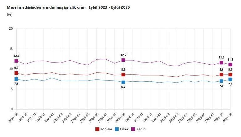 TÜİK, Eylül 2025 dönemine ilişkin iş gücü istatistiklerini açıkladı. Buna göre; 15 ve daha yukarı yaştaki kişilerde işsiz sayısı 2025 yılı Eylül ayında bir önceki aya göre 12 bin kişi artarak 3 milyon 75 bin kişi oldu. İşsizlik oranı değişim göstermeyerek yüzde 8,6 seviyesinde gerçekleşti. İşsizlik oranı erkeklerde yüzde 7,4 iken kadınlarda yüzde 11,1 olarak kaydedildi. İstihdam edilenlerin sayısı 2025 yılı Eylül ayında bir önceki aya göre 200 bin kişi azalarak 32 milyon 491 bin kişi, istihdam oranı ise 0,3 puan azalarak yüzde 48,9 oldu. Bu oran erkeklerde yüzde 66,3 iken kadınlarda yüzde 31,8 olarak gerçekleşti. İş gücü, 2025 yılı Eylül ayında bir önceki aya göre 188 bin kişi azalarak 35 milyon 566 bin kişi, iş gücüne katılma oranı 0,3 puan azalarak yüzde 53,5 olarak gerçekleşti. İş gücüne katılma oranı erkeklerde yüzde 71,6 iken kadınlarda yüzde 35,7 oldu.