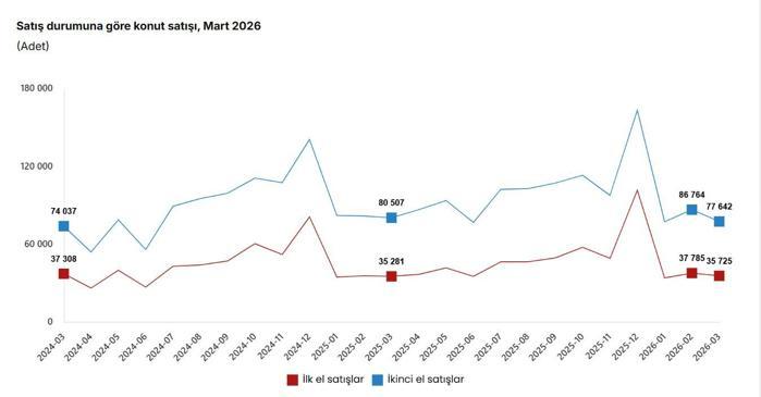 TÜİK, Mart 2026 dönemine ilişkin konut ve iş yeri satış istatistiklerini açıkladı. Buna göre; Türkiye genelinde ilk el konut satış sayısı mart ayında bir önceki yılın aynı ayına göre yüzde 1,3 oranında artarak 35 bin 725 oldu. İkinci el konut satışları ise mart ayında bir önceki yılın aynı ayına göre yüzde 3,6 oranında azalarak 77 bin 642 oldu. Toplam konut satışları içinde ilk el konut satışlarının payı yüzde 31,5, ikinci el konut satışlarının payı yüzde 68,5 oldu.