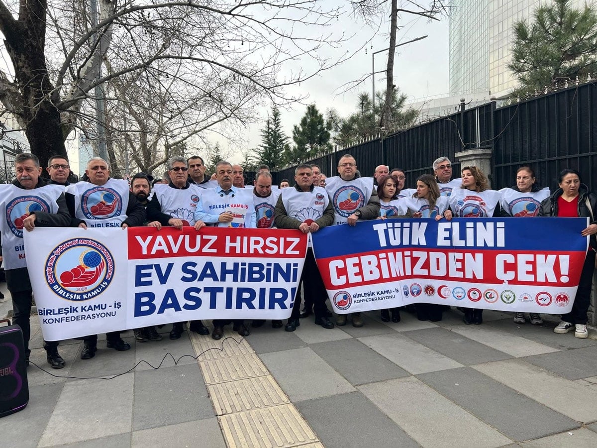 Ankara’da TÜİK binası önünde eylem yapan Birleşik Kamu-İş Konfederasyonu üyeleri, ‘Yavuz hırsız ev sahibini bastırır’ diyerek, ‘TÜİK elini cebimizden çek’ yazılı pankartı taşıdı. Konfederasyonun açıklamasında, “Şubat masalı da ortaya çıktı, yalan rüzgarlarına tahammülümüz yok” ifadeleri kullanıldı.