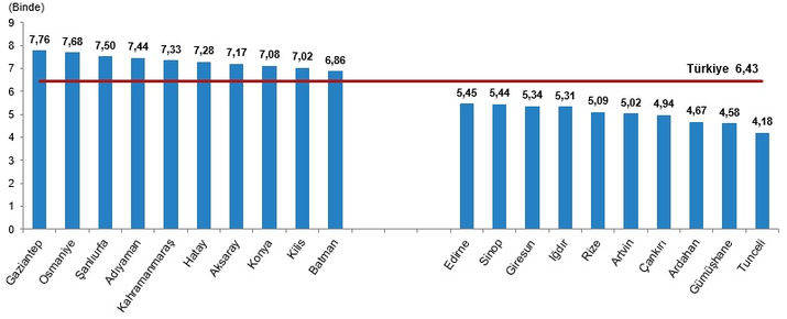 Cinsiyete göre ortalama ilk evlenme yaşı, 2001-2025 KABA EVLENME HIZININ EN YÜKSEK OLDUĞU İL, BİNDE 7,76 İLE GAZİANTEP OLDU Kaba evlenme hızının 2025 yılında en yüksek olduğu il, binde 7,76 ile Gaziantep oldu. Bu ili binde 7,68 ile Osmaniye, binde 7,50 ile Şanlıurfa izledi. Kaba evlenme hızının en düşük olduğu il ise binde 4,18 ile Tunceli oldu. Bu ili binde 4,58 ile Gümüşhane, binde 4,67 ile Ardahan izledi.