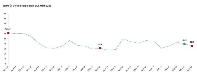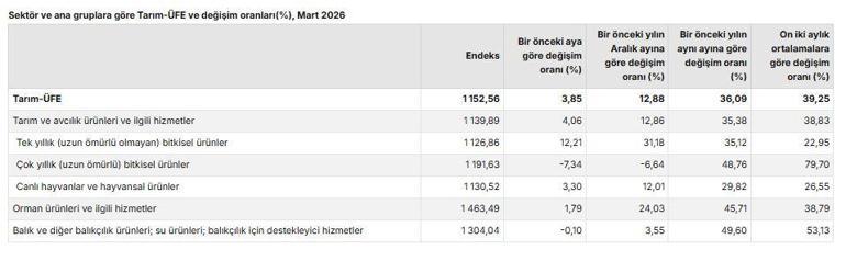 TÜİK, Mart 2026 dönemine ilişkin tarım ürünleri üretici fiyat endeksi verilerini açıkladı. Buna göre; tarım ürünleri üretici fiyatları, 2026 yılı Mart ayında bir önceki aya göre yüzde 3,85, bir önceki yılın aralık ayına göre yüzde 12,88, bir önceki yılın aynı ayına göre yüzde 36,09 ve 12 aylık ortalamalara göre yüzde 39,25 arttı. Sektörlerde bir önceki aya göre; tarım ve avcılık ürünleri ve ilgili hizmetlerde yüzde 4,06 artış, ormancılık ürünleri ve ilgili hizmetlerde yüzde 1,79 artış ve balık ve diğer balıkçılık ürünleri; su ürünleri; balıkçılık için destekleyici hizmetlerde yüzde 0,10 azalış gerçekleşti. Ana gruplarda bir önceki aya göre, tek yıllık (uzun ömürlü olmayan) bitkisel ürünlerde yüzde 12,21 artış, çok yıllık (uzun ömürlü) bitkisel ürünlerde yüzde 7,34 azalış ve canlı hayvanlar ve hayvansal ürünlerde yüzde 3,30 artış gerçekleşti. Yıllık değişimin en yüksek olduğu alt grup yüzde 56,36 artış ile diğer ağaç ve çalı meyveleri ile sert kabuklu meyveler, aylık değişimin en yüksek olduğu alt grup yüzde 20,37 artış ile sebze ve kavun-karpuz, kök ve yumrular oldu.