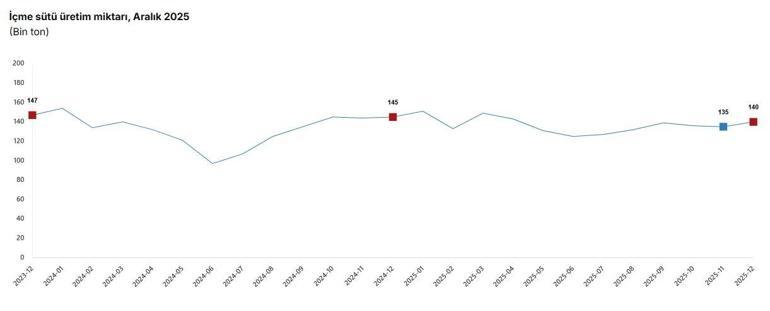 Ticari süt işletmeleri tarafından toplanan inek sütü miktarı, aralık ayında bir önceki yılın aynı ayına göre; yüzde 1,7 azaldı, ocak-aralık döneminde bir önceki yılın aynı dönemine göre yüzde 0,5 azaldı. Bir önceki ay 863 bin 651 ton olan ticari süt işletmelerince toplanan inek sütü miktarı aralık ayında yüzde 7,8 oranında artarak, 930 bin 898 ton oldu. Bir önceki ay 135 bin 49 ton olan içme sütü üretimi aralık ayında yüzde 3,4 oranında artarak 139 bin 645 ton olarak gerçekleşti. Aralık ayında bir önceki yılın aynı ayına göre; inek peyniri üretimi yüzde 0,5 azaldı, ayran ve kefir üretimi yüzde 14,9 arttı, yoğurt üretimi yüzde 10 arttı, içme sütü üretimi yüzde 3,6 azaldı, tereyağı ve sadeyağ üretimi yüzde 0,3 azaldı. Ocak-aralık döneminde bir önceki yılın aynı dönemine göre; inek peyniri üretimi yüzde 1,3 arttı, ayran ve kefir üretimi yüzde 9,3 arttı, yoğurt üretimi yüzde 5,5 arttı, içme sütü üretimi yüzde 3,9 arttı, tereyağı ve sadeyağ üretimi yüzde 5,5 arttı.