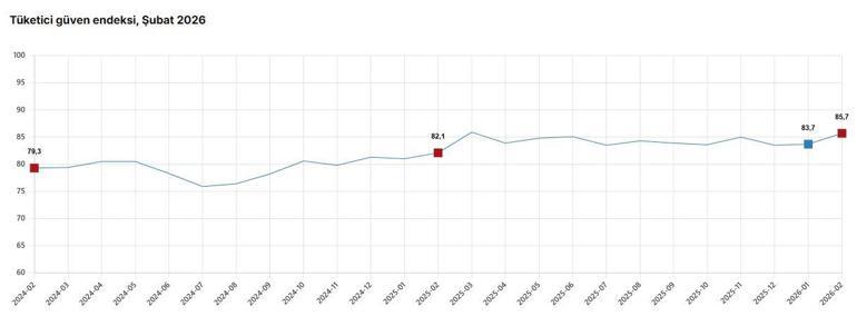TÜİK, Şubat 2026 dönemine ilişkin tüketici güven endeksi verilerini açıkladı. Buna göre; tüketici güven endeksi, şubat ayında bir önceki aya göre yüzde 2,3 oranında artarak 85,7 oldu. Alt endekslerine bakıldığında; bir önceki aya göre mevcut dönemde hanenin maddi durumu endeksi 4,6 artarak 71,3, gelecek 12 aylık dönemde hanenin maddi durum beklentisi endeksi 4,2 artarak 86,8, gelecek 12 aylık dönemde genel ekonomik durum beklentisi endeksi 0,1 azalarak 81,4 ve gelecek 12 aylık dönemde dayanıklı tüketim mallarına harcama yapma düşüncesi endeksi 1,3 artarak 103,2 değerlerini aldı.