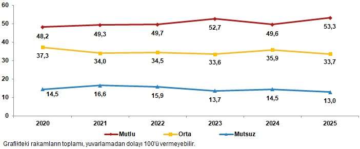 TÜİK Yaşam Memnuniyeti Araştırması 2025 yılı sonuçlarına göre Türkiye'de mutlu olduğunu beyan eden 18 ve üzeri yaştaki bireylerin oranı, 2024 yılında yüzde 49,6 iken 2025 yılında 3,7 puan artarak yüzde 53,3 oldu. Mutsuz olduğunu beyan eden bireylerin oranı ise 2024 yılında yüzde 14,5 iken 2025 yılında 1,5 puan azalarak yüzde 13,0 olarak gerçekleşti.