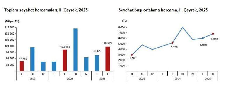 Yerli turistlerin, yurt içinde yaptıkları seyahat harcamaları, bir önceki yılın aynı çeyreğine göre yüzde 13,4 artarak 116 milyar 933 milyon 487 bin TL olarak gerçekleşti. Bu harcamaların yüzde 85,2'sini 99 milyar 655 milyon 181 bin TL ile kişisel harcamalar, yüzde 14,8'ini ise 17 milyar 278 milyon 306 bin TL ile paket tur harcamaları oluşturdu. Seyahat başına yapılan ortalama harcama ise 6 bin 848 TL oldu.